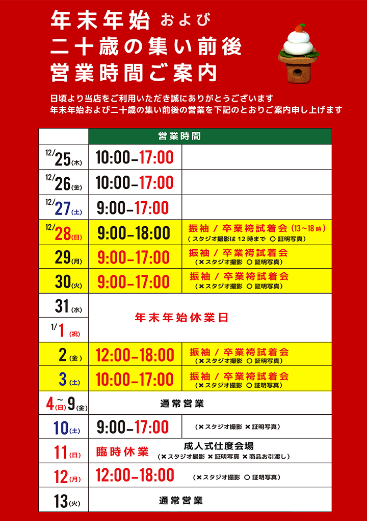 年末年始および二十歳の集い前後の営業につきまして、下記のとおりご案内申し上げます。